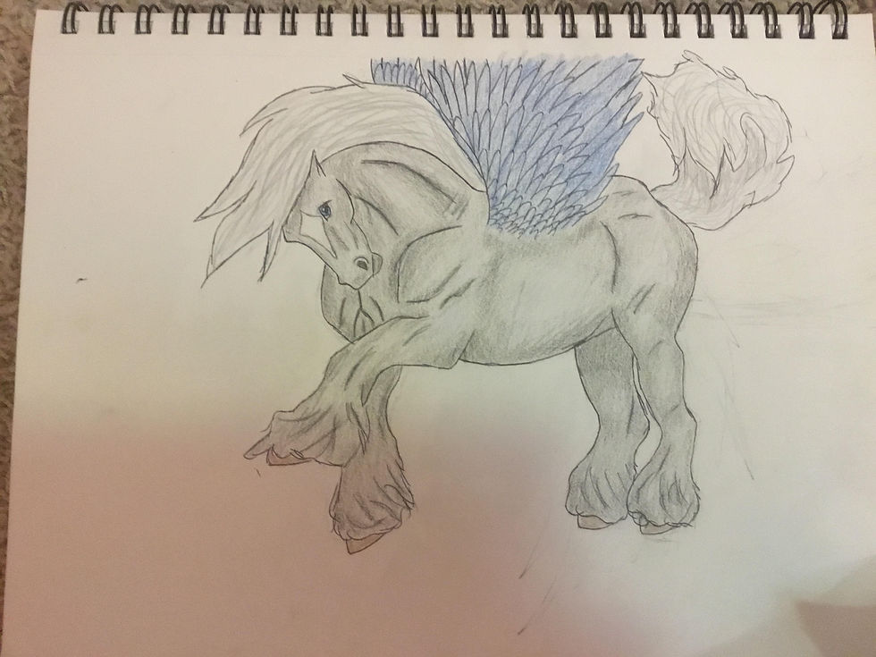 The drawing I decided to redraw is the very first pegasus drawing I ever made and it's of my first TGH OC, Ambersky, a mare from Jungle Herd (hence the tree in the picture XD). I drew the original in November(ish) 2015 (I was 12 at the time).