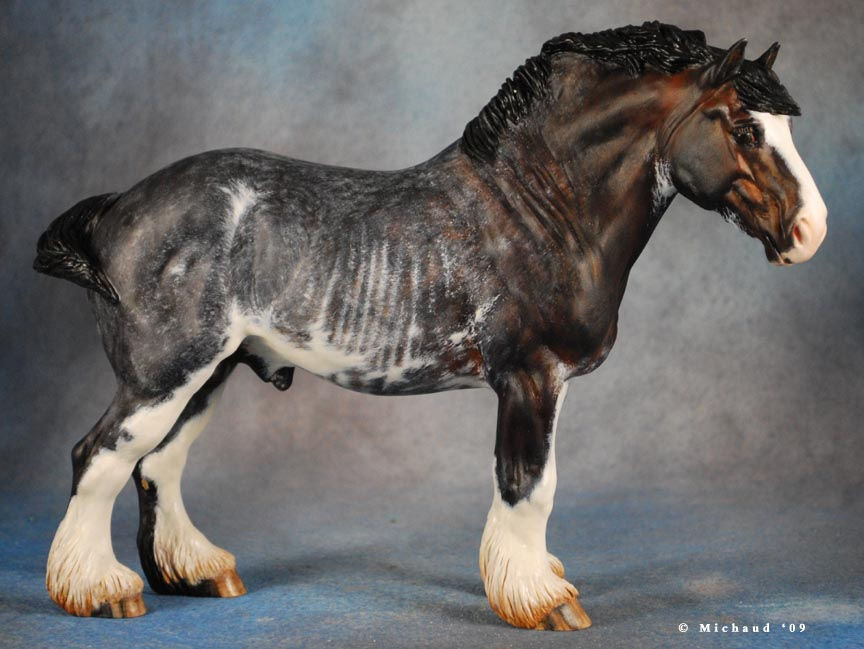 Description: Dark bay mare with orange feathers, white star and stripe on face, four white ankles, black mane and tail.